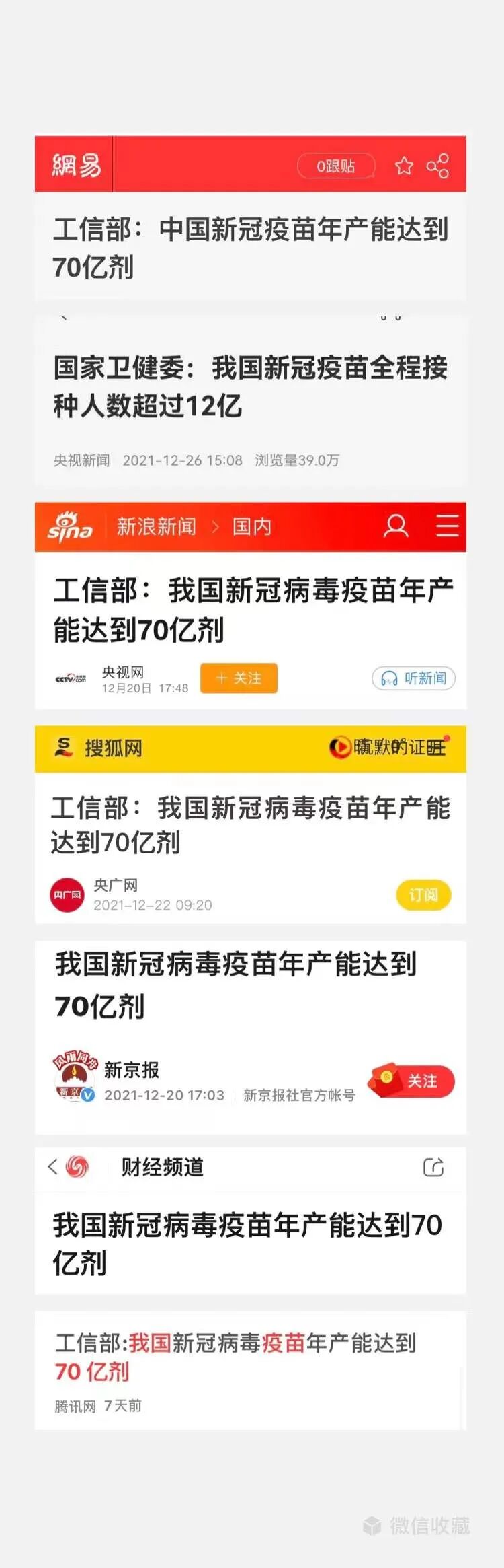 这么多国家级媒体和地方重量级媒体都在转发此消息,而且都用同一个标题:“我国新冠病毒疫苗年产能达到70亿剂。”说明谁都知道这句话是重点,也从侧面告诉我们:此事非同小可。至于怎么理解,那是周瑜打黄盖——那就是每个人自己的事了。