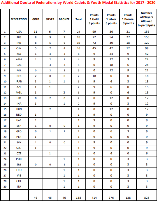 根据2017年至2020年的“奖牌统计表”,某些协会可报更多棋手。具体配额请参阅下表。简单地说,往年世少赛成绩越好的成员协会,配额越多。中国国际象棋协会可最多报名99人!