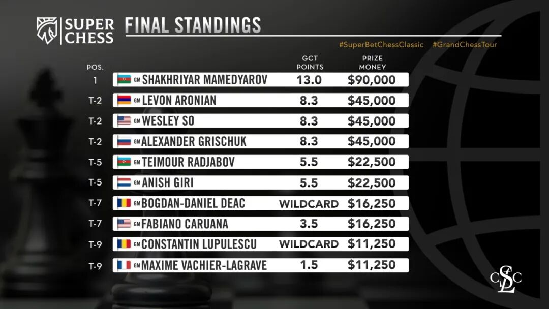 马梅季亚洛夫不但收获了9万美元冠军奖金,同时拿到了13个超巡赛积分。马梅的实时等级分也涨了12分,以2782分升至世界第五。