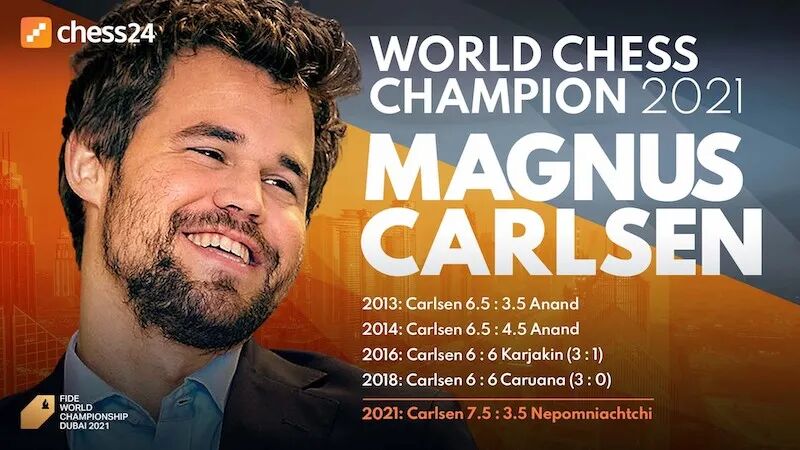 本次世界冠军赛是卡尔森五次世界冠军赛中,比分最悬殊的一次。在原定14盘棋的比赛,卡尔森仅用11盘,便以7.5比3.5的绝对优势,战胜挑战者涅波姆尼亚奇,成功卫冕。