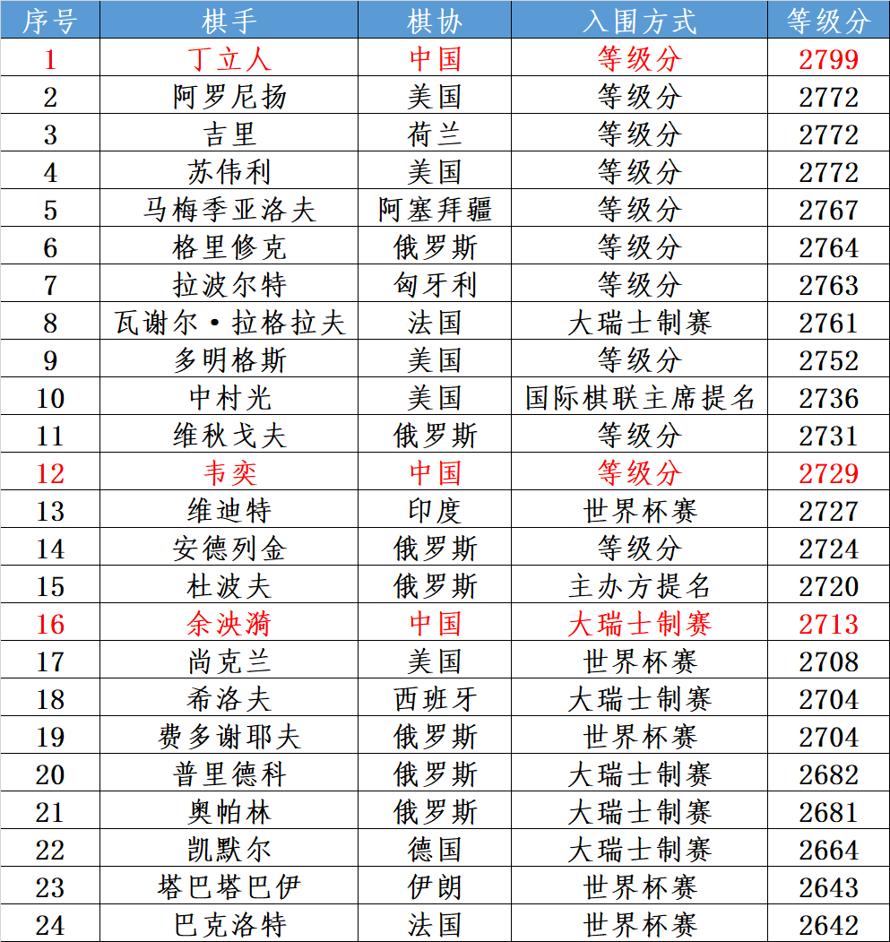 至此,2022年国际棋联男子大奖赛的所有24名入围棋手全部揭晓。具体名单和入围方式如下: