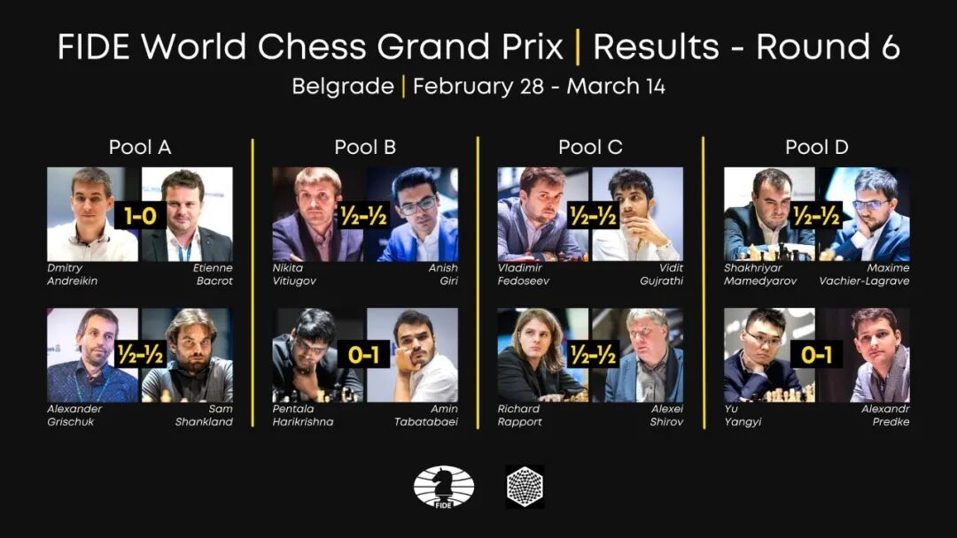 其他三个组中,B组的荷兰棋手吉里和C组的匈牙利棋手拉波尔特收官战顺利弈和各自对手,轻松出线。A组的俄罗斯棋手安德列金收官战力克法国棋手巴克洛特,在最后时刻脱颖而出,晋级半决赛。