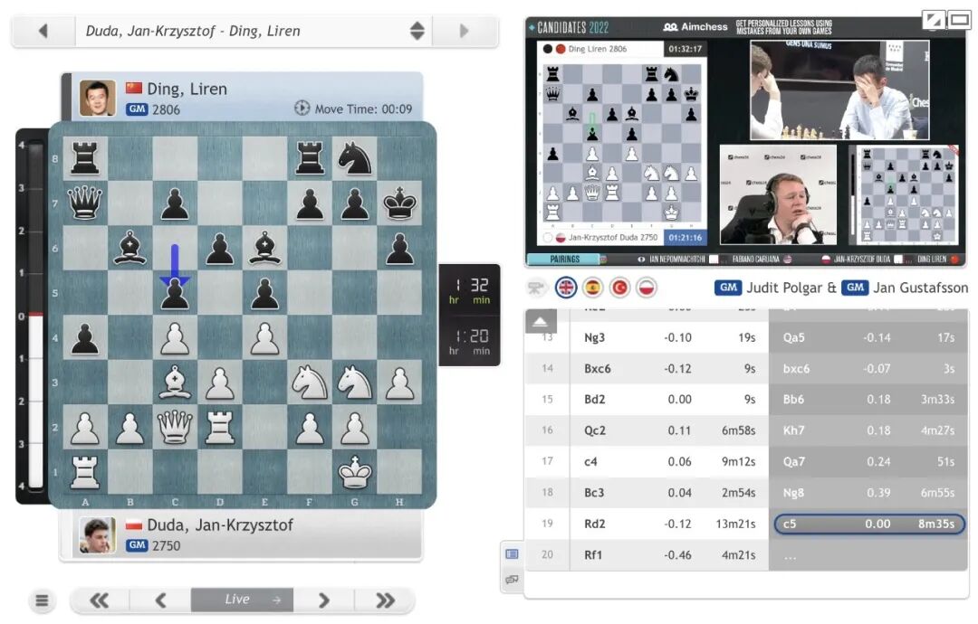 这盘棋,双方进入意大利开局。开局阶段,丁立人准备充分,耗时不多,顺利获得均势甚至稍优的局面。对于丁立人在开局阶段的一些精彩调动,讲棋嘉宾小波尔加和古斯塔夫森都表示印象深刻,而杜达赛后甚至说:“他(丁立人)下了一些我一百万年都想不到的招法!”