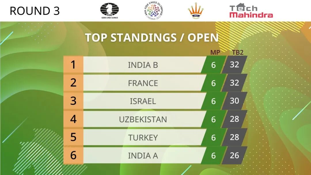 由四位神童担纲的印度男子二队以三轮比赛12局全胜的满分成绩,暂列公开组榜首。保加利亚女队以三轮比赛场分6分局分11.5分在女子组暂时领跑。