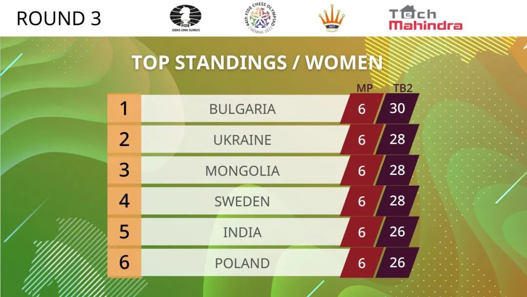 所有19支三连胜的队伍中,成绩最好的15号种子保加利亚女队。虽然前世界棋后斯坦芳诺娃缺席本届奥赛,但保加利亚女队前三轮12盘棋得了11.5分,目前暂时领跑积分榜。乌克兰队、蒙古队、瑞典队、印度一队和波兰队暂列第2~6位。此外,东道主印度女子二队和三队也都取得了三连胜。