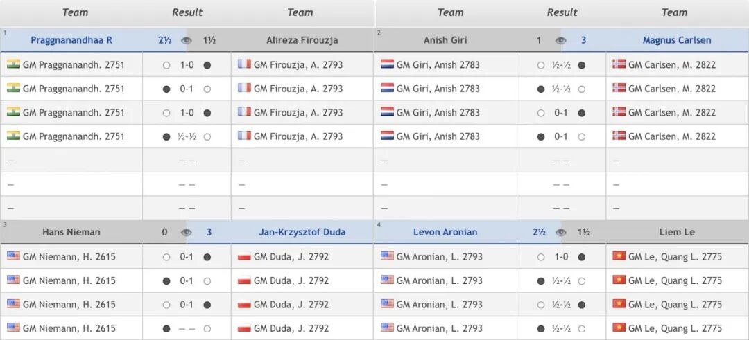 在北京时间8月16日凌晨结束的首轮比赛中,棋王卡尔森以3比1击败老对手吉里,杜达则3比0轻取尼曼,阿罗尼扬和普拉格纳南达则以2.5比1.5的相同比分,分别战胜黎光廉和菲罗贾。