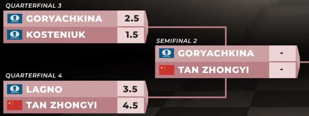 这样,谭中怡在四盘15分钟快棋赛后,以2.5比1.5胜出,进而以总比分4.5比3.5,淘汰拉戈诺,晋级半决赛。她将与俄罗斯棋手戈尔亚奇金娜争夺候选人赛决赛入场券。