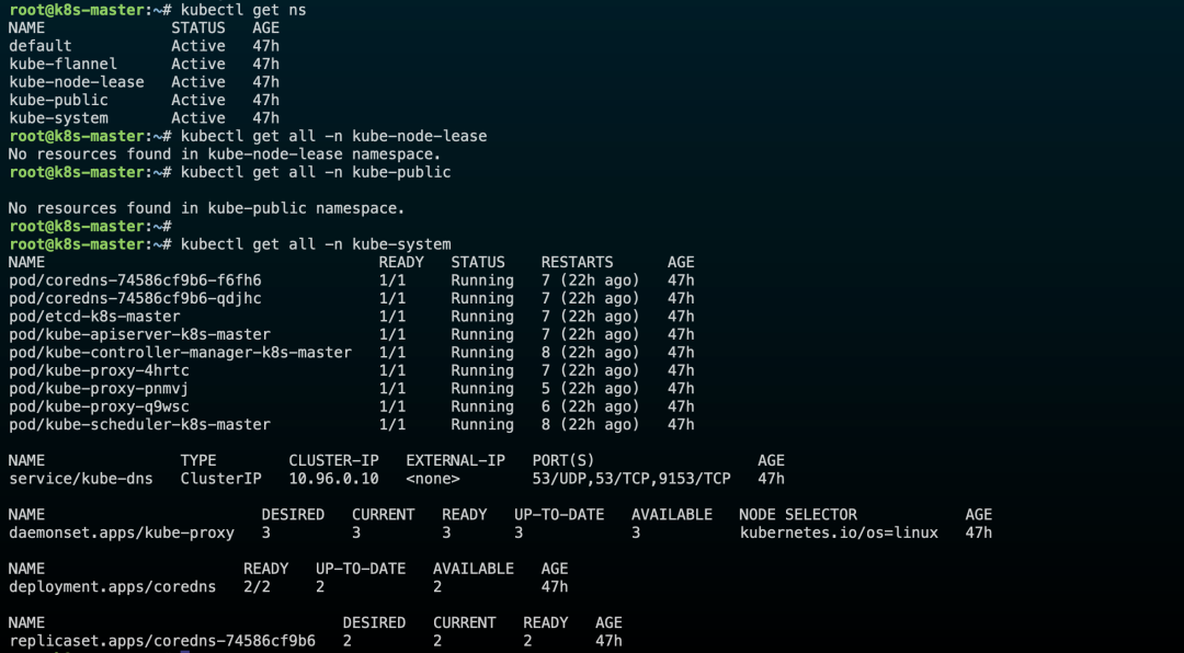 下图为使用kubeadm搭建的k8s集群默认的ns以及相关资源。