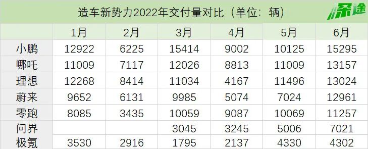 今年上半年,整个造车江湖仿佛掉进了“无限流”,缺芯、缺电池、缺零部件、原材料涨价、疫情,一轮又一轮的供应链危机冲击着车企。造车新势力们产能上不去,销量被迫腰斩。5月底,上海开始复工复产,汽车供应链逐渐恢复。没了掣肘,车企们甩开膀子,加班加点交付产品、发新车。6月,汽车行业产能和销量大爆发,小鹏、理想、蔚来、零跑、哪吒都实现了月销破万。其中,小鹏依旧是造车新势力的销冠,一口气交付了15295辆。哪吒交付13157辆;理想,交付13024辆;蔚来,12961辆;零跑,11259辆。就连问界,也交付了7021辆。![]()