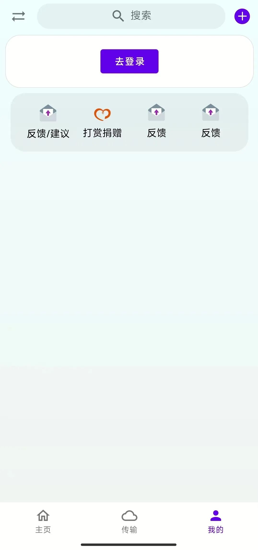 这款软件名叫:雨.盘,是一款高颜值的第三方软件,软件安装后打开,这里所有的功能都需要登录帐号才能使用。登录以后。软件分为“主页”、“传输”和“我的”三大功能版块。