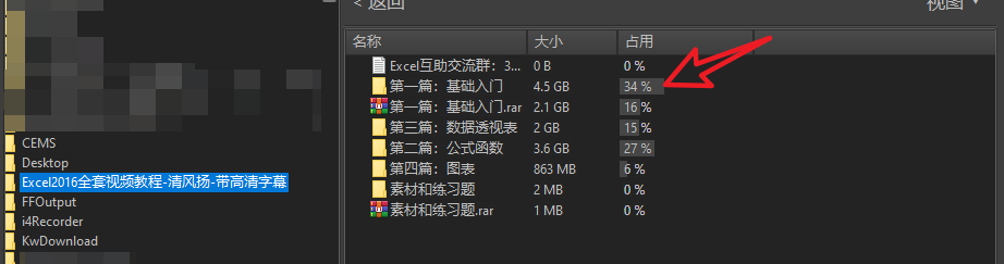 我这台电脑其实平时比较少下载文件,但没想到视频还有24G,点击视频,进入到详情,这才发现给同事下载的Excel视频课程占了好大空间。