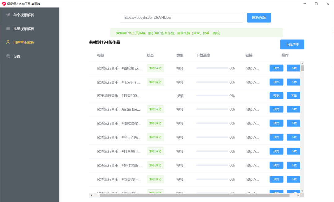 如果想要批量下载某个博主的所有视频,可以使用【用户主页解析】的功能,解析出来的结果同样支持预览和下载。