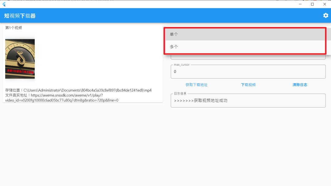 软件只有【获取下载地址】、【下载视频】两个功能。把地址粘贴进去后,点击获取地址,等待获取成功后即可下载视频。