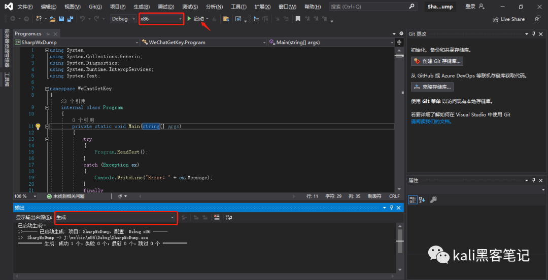 3.9.0.28)Python3.8Navicat16如果没有vs工具,我们需要先安装vs2019(其他版本未知)。安装过程比较漫长,可以自行搜索解决。我们首先需要编译工具SharpWxDump。下载项目到我们的本地。在vs中导入项目。设置框架为x86点击启动,进行编译。