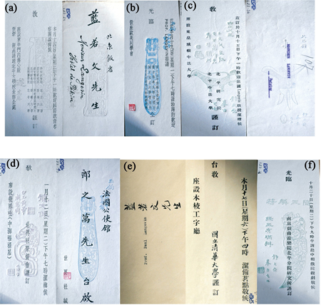 图3 朗之万收到的教育、研究和文化机构的部分请柬 (a)北平市教育局、北平研究院、故宫博物院、北平图书馆、天然博物院、北京大学、清华大学、历史语言研究所、师范大学、北平大学联合请柬;(b)国立北平师范大学物理系、国立清华大学物理系、国立北京大学物理系、国立北平研究院物理研究所联合请柬;(c)北平研究院和北平中法大学请柬;(d)世界社请柬;(e)清华大学请柬;(f)南京戏曲音乐院北平分院请柬