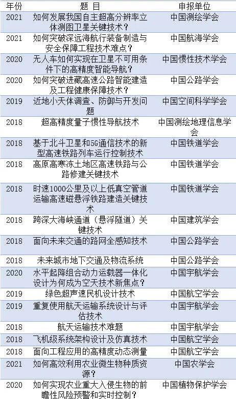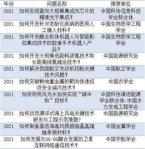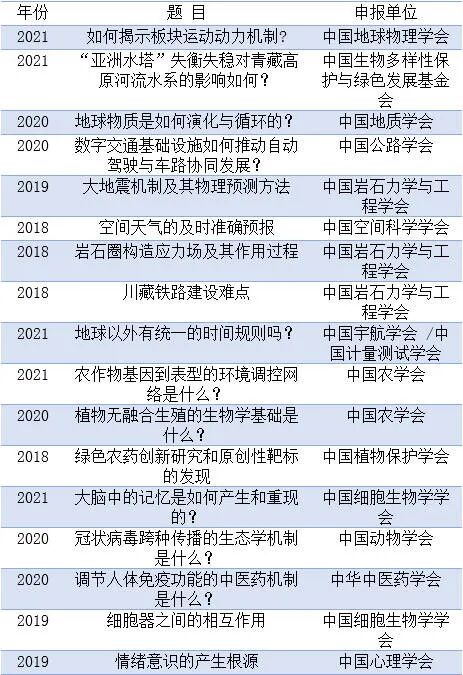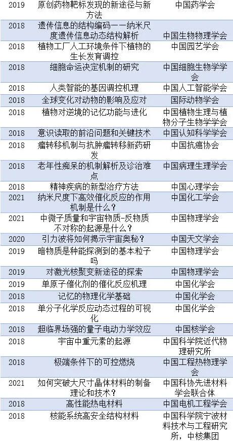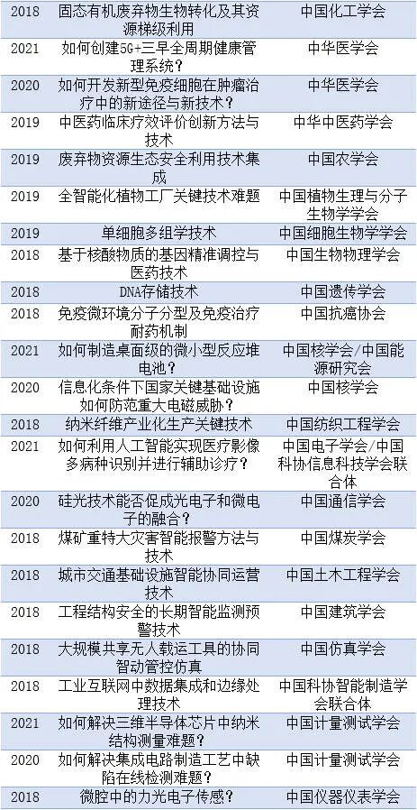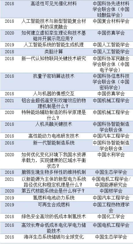 为研判未来科技发展趋势、抓住科技创新突破口、前瞻谋划和布局前沿科技领域与方向,推进世界科技强国建设,中国科协通过各全国学会、学会联合体,部分中央企业和非公企业科协,面向广大科技工作者征集重大前沿科学问题与工程技术难题。现将2018-2021终选出的前沿科学问题、2018-2021工程技术难题、及2021年产业技术问题清单公布如下。