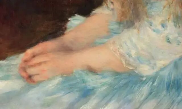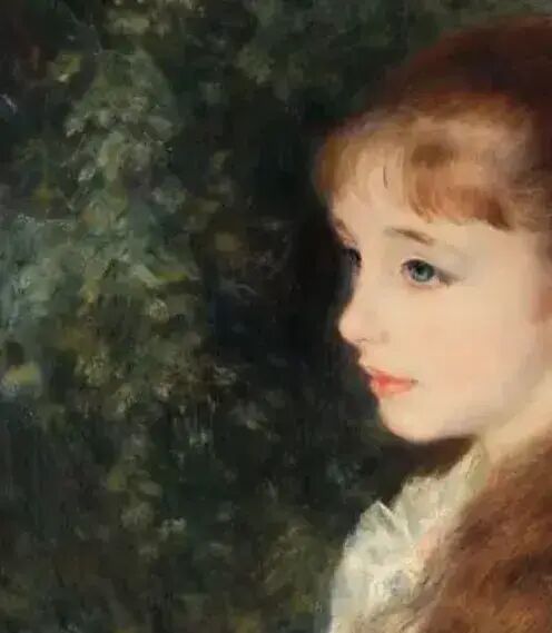作为印象派画家,往往更注重色彩与光线,相应的人物会缺乏“真实感”,可雷诺阿在绘画小艾琳时,却仿佛让她在画布上活了。雷诺阿采用一片深色树丛作为背景,一冷一暖、一深一浅的对比衬托出少女白皙的皮肤、吹弹可破的肌肤质感,让人忍不住想要伸手触碰。少女纤长浓密的睫毛根根分明,如同颤动的蝴蝶翅膀,下面隐藏着一双动人的澄澈眼眸。这双眼睛盛满了天真,淡淡地望向远方,似乎对未来怀揣着说不清道不明的期待,却又有着隐隐约约的哀愁。少女嘴巴紧闭,不见笑意,似乎正在思虑着什么,可恰恰是这种神态,让她多了一份超脱同龄人的成熟,更加吸引人的目光,不由得想要走进少女的内心世界。而刻画少女的衣裙时,雷诺阿又采用了松弛的大笔触,没有明显的线条和边界,营造出朦胧氤氲的氛围感,美好得如同白日梦境。可无论是小艾琳挺直的后背,还是微微握在一起的手,都略显紧张与拘谨,可偏偏如此恰好体现了少女特有的姿态,青涩而懵懂,是树枝上尚未成熟的果实。最纯粹简单、也最复杂迷人,像是“少女版的蒙娜丽莎”。因此,纵然雷诺阿画的女人再多再美,这幅《小艾琳》也成为雷诺阿最具代表性的画作之一,甚至可以排入艺术史上女性肖像画top10。画中的小艾琳在100多年里承载了人们无数赞美,引发了无数想象,直至成为了一个美的符号,有人称她为“油画史上的最美少女”、“绘画史上最强的美少女”。可在当时,就在雷诺阿信心满满地交付作品时,却遭到了无情的打击。当时有钱人找画家画肖像画,无非是彰显自己的财富与地位,例如雷诺阿所画的《夏庞蒂埃夫人和她的孩子们》就很好地展现了一个富人家庭的日常,而这幅画也让他一战成名,接到了不少肖像画的订单。小艾琳的爸爸气得不仅把画放到了佣人的房间,还拖着酬劳不支付,直到一年多过去了,才付了一半的费用。但是他们依旧有了第二次的合作,小艾琳的爸爸又委托雷诺阿画小艾琳的两个妹妹,这一次雷诺阿吸取教训,无论是刻画人物还是背景都倍显华丽,总算得到了甲方的满意。相较于《粉与蓝》的奢华与繁复,《小艾琳》简约而沉静,更加耐人寻味,引人探究少女背后的故事。事实上,谁也没有想到雷诺阿记录下的是小艾琳一生中最快乐的时光,长大后的她命运坎坷,再也不见雷诺阿笔下跳跃的光彩。刚刚过了19岁,小艾琳就嫁人了,结婚对象是犹太银行世家的继承人。按理说这是一桩门当户对的婚姻,完全是烈火烹油、鲜花着锦。小艾琳的丈夫卡蒙度伯爵整整比她大12岁,他们基本没有共同语言,而因利益走到一起的二人也几乎毫无感情。婚后,他们育有一儿一女,但卡蒙度伯爵很快有了情人,不甘寂寞的小艾琳也选择出轨,两个人的婚姻渐渐名存实亡。小艾琳的儿子因为车祸意外丧失,而她的女儿则重复着和小艾琳一样的命运,接受了家族的包办婚姻,嫁给了一个犹太望族的后人,也生下了一儿一女。在时代的巨轮之下,个人如一粒尘埃,显得如此渺小与无力。随着二战的爆发,小艾琳女儿一家因是犹太人被抓入了奥斯维辛集中营,并惨遭杀害。小艾琳一夜之间失去了女儿、女婿、以及两个可爱的外孙,而自己家人、前夫的整个家族也不复存在。一场战争,让已经满头白发的小艾琳孑然一身,陪伴她的老朋友唯有那幅《小艾琳》。在战时,画作被纳粹掠走,成为了“希勒特接班人”戈林的藏品。直到二战结束,这幅画作为女儿的遗物,由小艾琳继承。几十年过去,画外人再看画中人,只让人感慨物是人非,人生如同大梦一场,梦里荒唐,梦醒荒凉。这幅画如同一个印记,告诉小艾琳曾经的她有多美好,而今的她又承受了多少苦难。为了钱,小艾琳将这幅画卖给一家画廊,之后被著名收藏家埃米尔·乔治·布尔勒收入囊中。此后的十几年,小艾琳终日浑浑噩噩,将所有的财产挥霍一空,日子过得窘迫潦倒,最终在91岁永远告别了这个世界。如今这幅《小艾琳》藏于瑞士苏黎世布尔勒收藏展览馆,每一年都有无数人专程去看她。画卷里的小艾琳,依旧亭亭玉立,无忧无虑,未沾染半分尘世的烦忧,打破时间与空间的序列,人们一次又一次沉浸在她的美丽之中,而她的坎坷命运已经归于尘烟。那时的他已患有严重的风湿病,手已经变形到难以握住画笔,可他却依旧坚持画画。身旁的人问他:“你看上去那么痛苦,为什么还要画画?”