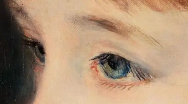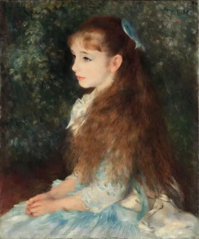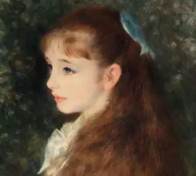 他不像其他印象派画家,反叛、前卫、具有野心,意图挑战当时的主流审美,他只想用绘画给人带去美与快乐。就像他曾经说的:“世界上不开心的事已经够多了,为什么艺术不能开开心心的呢?”因此,在好友莫奈沉迷于绘画不同光影下的自然风景之时,雷诺阿更偏爱玫瑰色的快活人间。这幅印象派的代表性作品《煎饼磨坊的舞会》正是出自雷诺阿之手。在欢乐的舞会上,年轻的男男女女欢声笑语、翩翩起舞,闪耀的阳光洒在他们身上,似乎连光都爱上了这人间的美妙。在他的画里,阴暗与忧愁消散,唯有夺目的光和用不完的活力。雷诺阿画的对象大多漂亮且充满生机,如儿童、女性、花朵,而他绘画的女性形象极富魅力,她们往往明媚娇美,光彩照人。大概正因为如此,雷诺阿在当时几乎是最受欢迎的印象派画家。不仅接到众多订单,在他去世之前就看到了自己的画挂进了卢浮宫。而在雷诺阿的绘画世界里,有一幅画如此有名,也如此特别。1880年,雷诺阿完成了一幅肖像画,立刻让不少人看呆了——画中是一名少女,她身着一袭水蓝色的连衣裙,瀑布般的金褐色长发自然垂落到腰际,头顶戴着同为水蓝色的蝴蝶结,与连衣裙相互呼应。她侧着身子,脸朝向前方,除了同龄人的纯真、灵动,少女又多了几分端庄与优雅。而她淡蓝色的眼眸、含蓄的表情似乎隐藏着忧郁且深邃的情绪,让这幅少女肖像更具神秘感,引人心折。这幅肖像画作名为《康达维斯小姐画像》,也叫《小艾琳》,画中少女是当时法国知名银行家路易·卡亨·安德维普8岁的女儿。银行家委托雷诺阿为爱女作画,为了完成此订单,雷诺阿可谓是煞费苦心。
