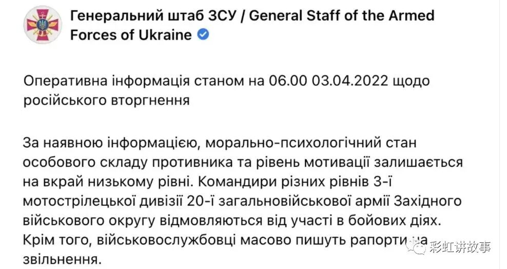 乌克兰军事情报部门4月3日评估,俄罗斯近卫第20集团军和第58军的许多军人拒绝参加乌克兰境内的军事行动。第58集团军的两个战术营正在返回其永久基地。俄罗斯军方正在撰写大量解雇报告。乌克兰武装部队还称,几名俄罗斯指挥官因士气低落而拒绝战斗。