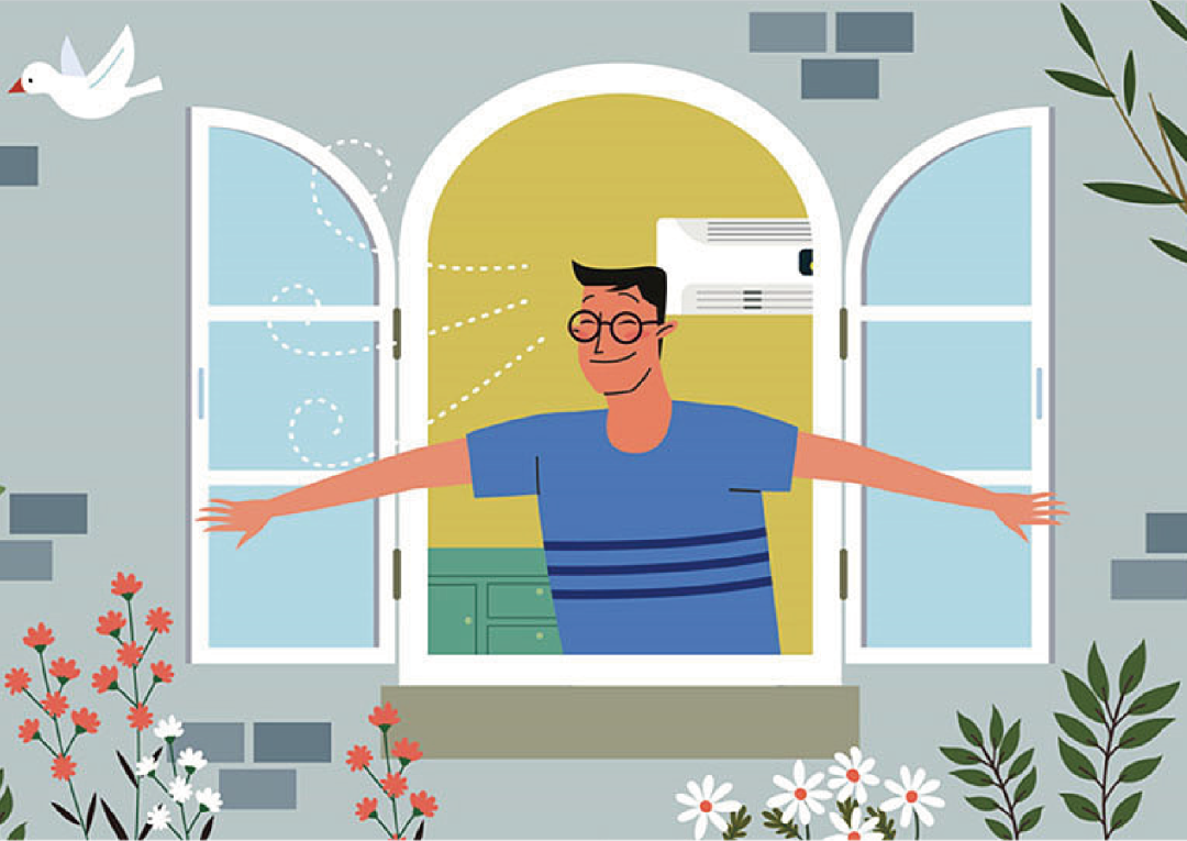 家里使用空调时,无法代替开窗通风。如果家中使用的是分体式空调,空气通过空调器后在室内自行循环,要注意开窗通风,及时清洗回风口的过滤网。
