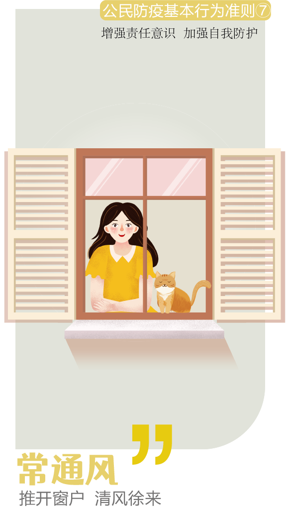 今天一起来了解公民防疫基本行为准则之七:常通风。经常开窗通风可保持室内空气新鲜流通,有利于身体健康。