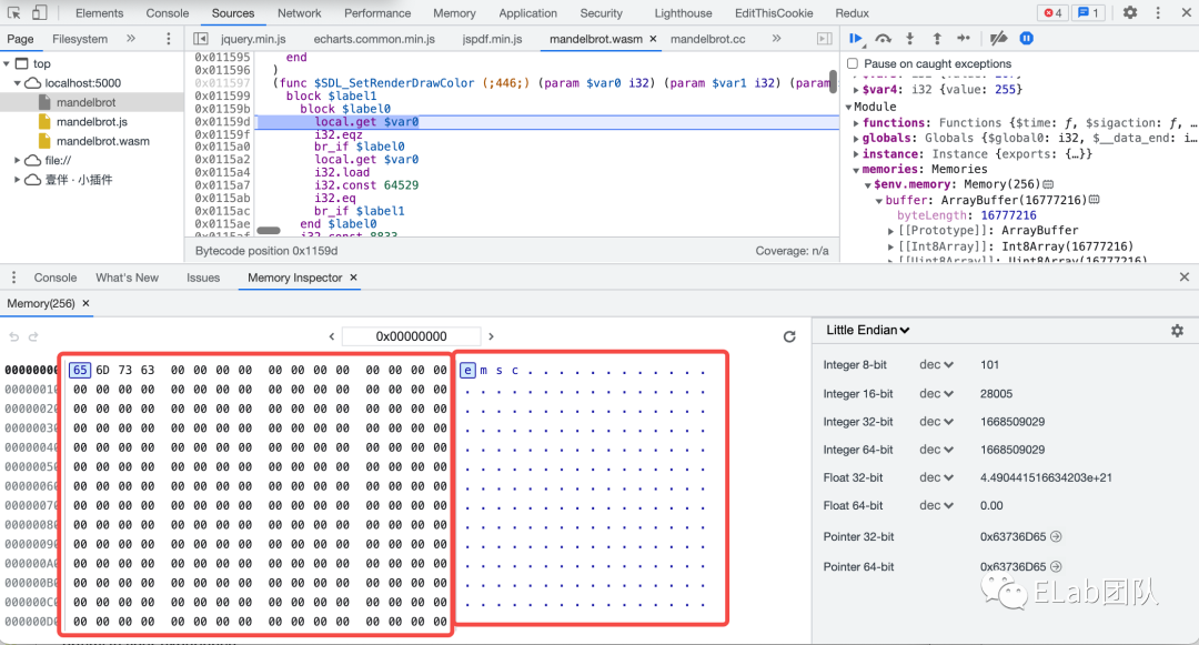 从内存面板里面可以查看以十六进制或 ASCII 的形式查看 WebAssembly 的内存,导航到特定的内存地址,将特定数据解析成各种不同的格式,如十六进制 65 代表的 e 这个 ASCII 字符。
