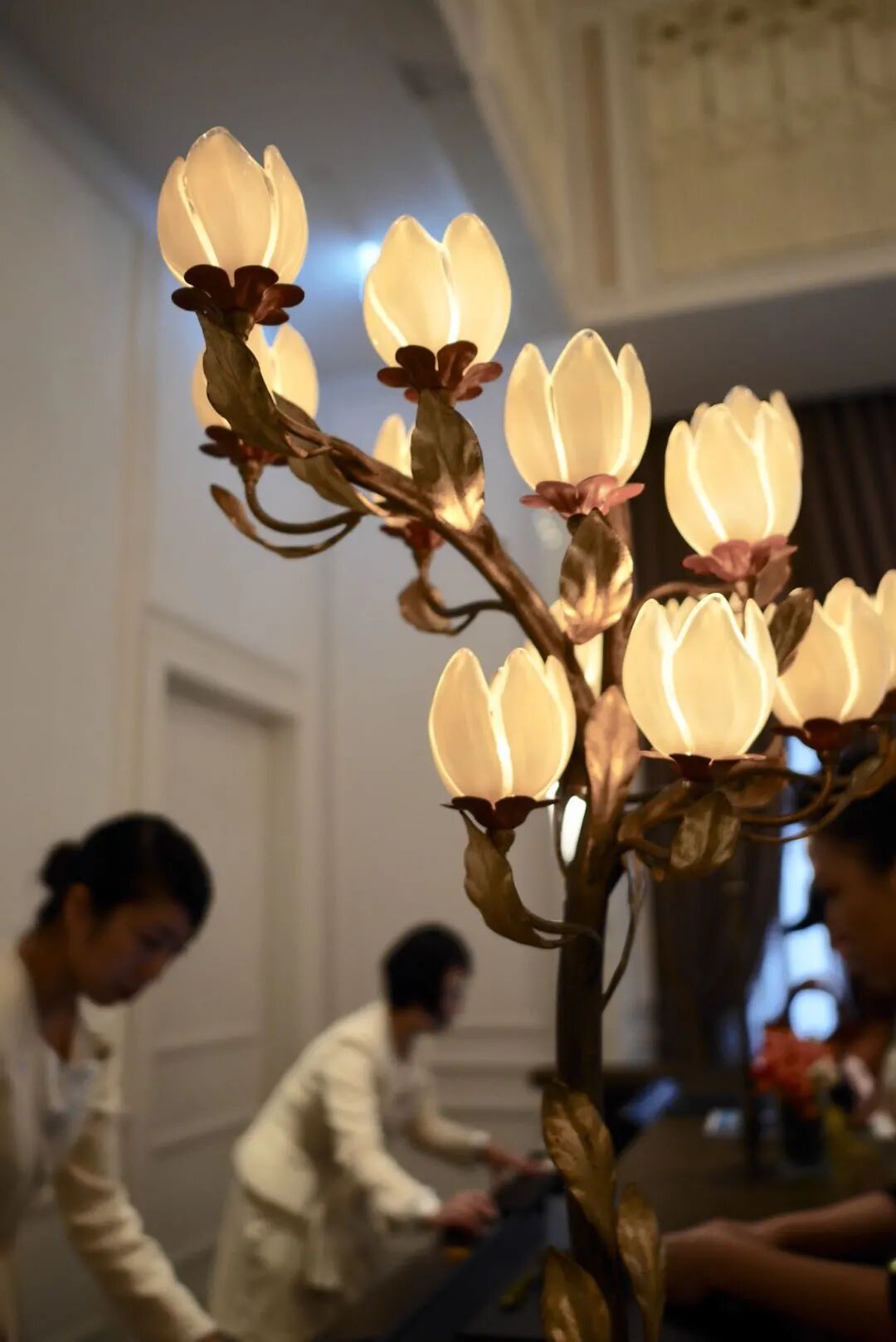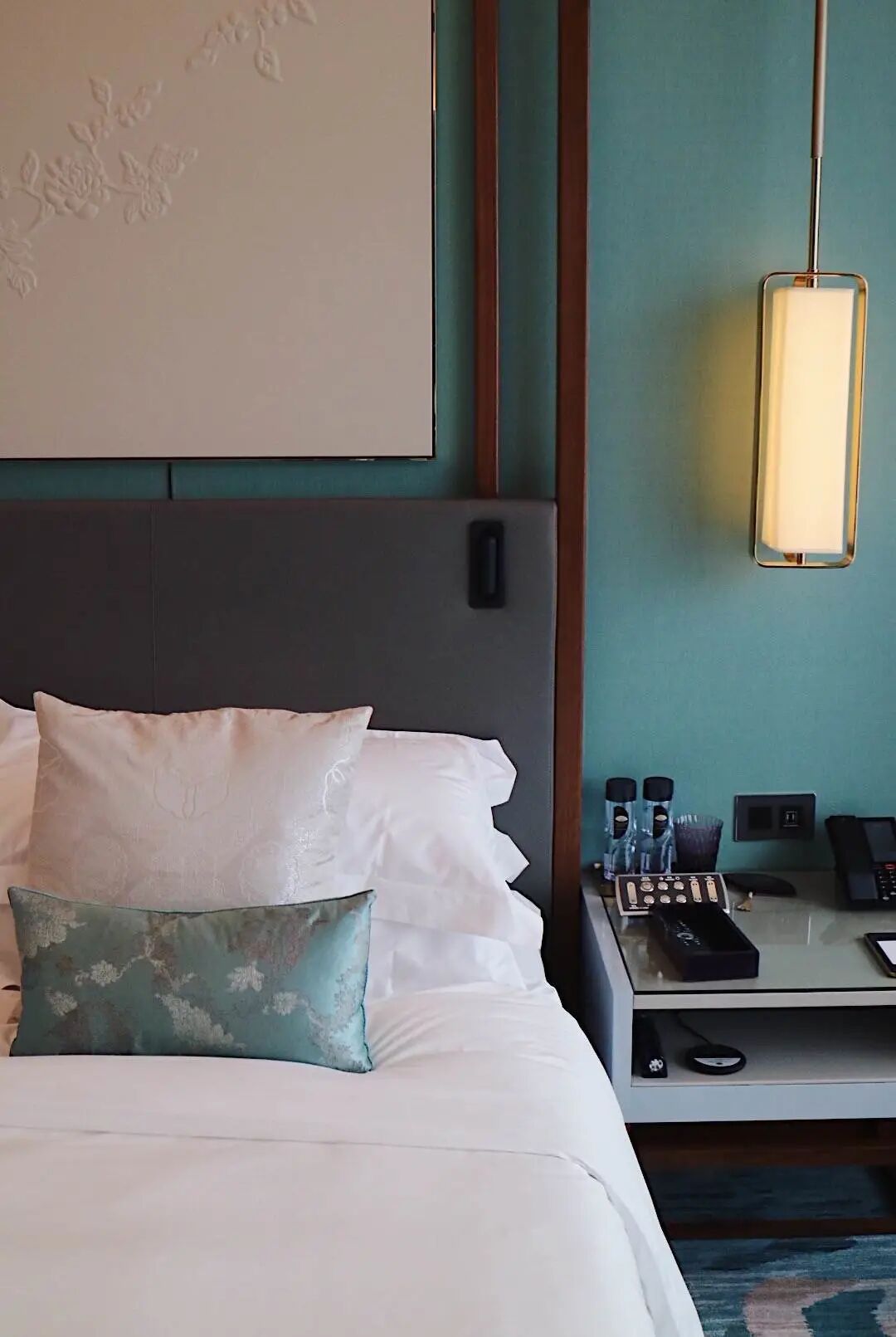 酒店内部的风格兼具古典雅致和当代气息,而一进门就打动到我的其实是大堂里悬挂的水晶灯,很多酒店的吊灯虽然精美但总是太过华贵笨重,而这盏出自捷克设计师之手,由5万颗水晶串珠和淡琥珀色水晶拼接而成,重达1700kg的水晶灯却和四周的线条相得益彰,只让我觉得轻盈通透,温柔自然。
