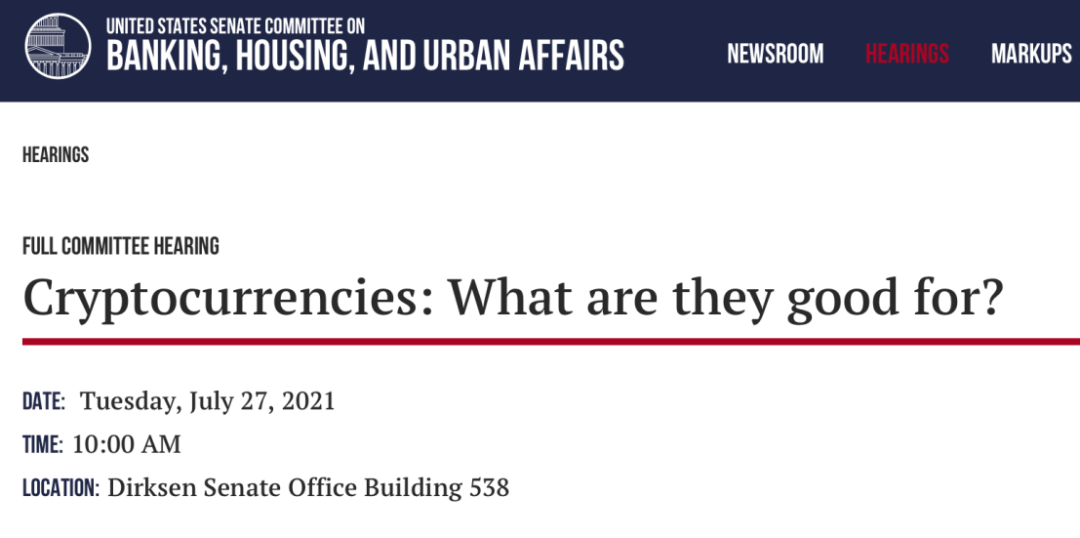 美国参议院银行、住房和城市事务委员会召开加密货币听证会,探讨加密货币是否波及金融体系,本次听证会是一场名以Cryptocurrencies:What are they good for?(加密货币有什么好处?)为主题的听证会。