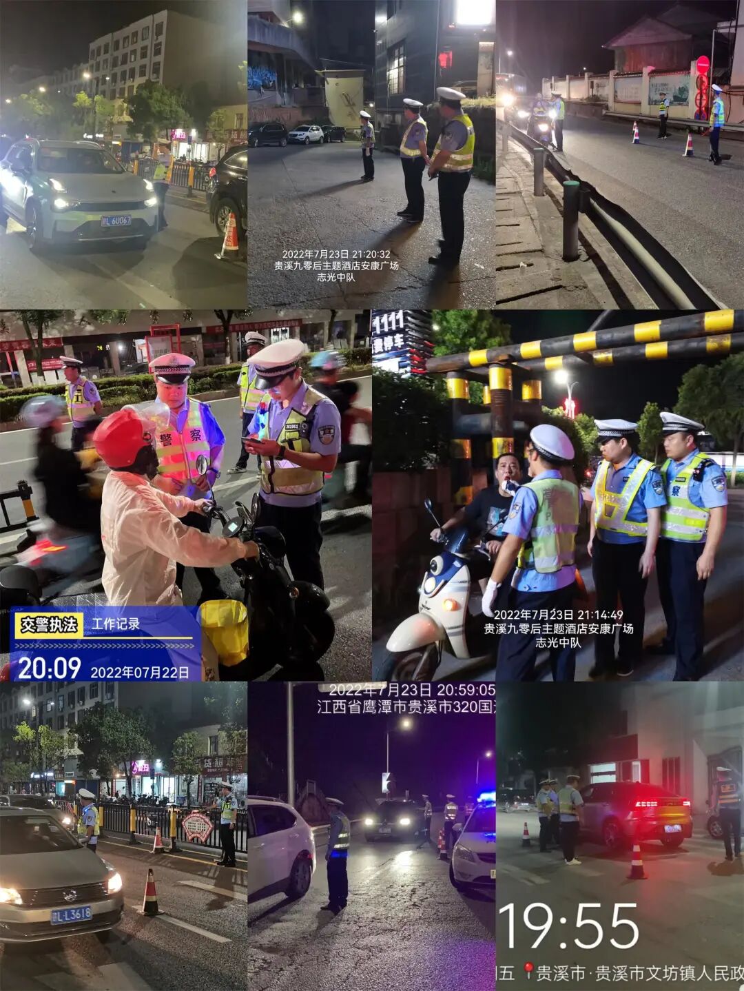 为扎实推进夏季交通安全专项整治“百日行动”,根据全国公安机关夏夜治安巡查宣防集中统一行动安排部署,7月22日至24日连续三天晚上20:00至次日凌晨2:00,贵溪交警在全市范围内,有序组织开展了夏夜治安巡查宣防集中统一行动,严查酒驾醉驾等严重交通违法行为。据统计,7月22日至24日出动警力350人次,警车60辆次,共查处交通违法行为842起,其中简易程序699起,酒驾21起,超员3起,超载1起,无证驾驶8起,违停拍照79起,拆除遮阳伞80把,不戴头盔8起,不系安全带22起。