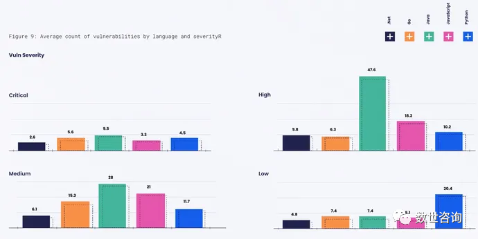 然而,数据还表明,不同的语言往往具有不同严重程度的缺陷。举个例子,用Java编写的项目平均具有超过47个高严重性漏洞和28个中等严重性漏洞,高出位居第二的JavaScript一大截(分别是18个和21个)。而Python则是低严重性漏洞数量最为可观,平均每个项目20个。