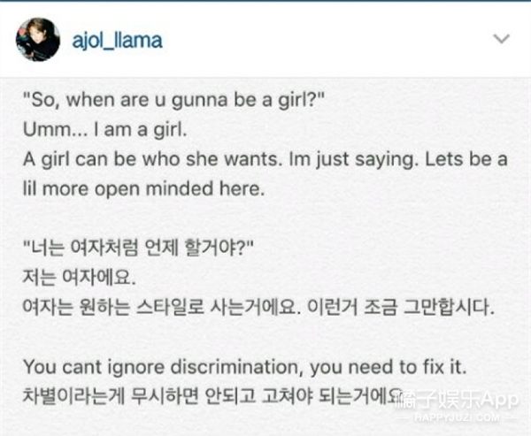 2016年,出道7年的Amber依然面临争议。她曾在个人Ins上用韩英双语写道:“你准备什么时候打扮的像个女生?其实我就是女生,女生可以按照自己想要的风格生活,让我们心态更开放一些吧。你无法忽视偏见,你应该去修正偏见。”