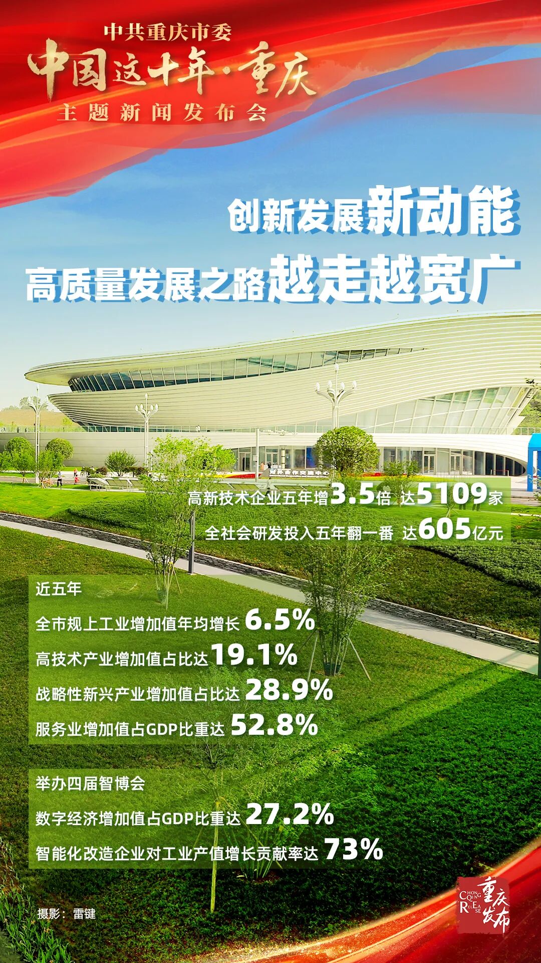 第二,创新发展增添新动能,高质量发展之路越走越宽广。我们以建设具有全国影响力的科技创新中心为目标,高标准建设西部(重庆)科学城、两江协同创新区、广阳湾智创生态城,金凤实验室、超瞬态实验装置等科研平台加快建设,高新技术企业五年增长3.5倍、达到5109家,全社会研发投入五年翻了一番、达到605亿元。