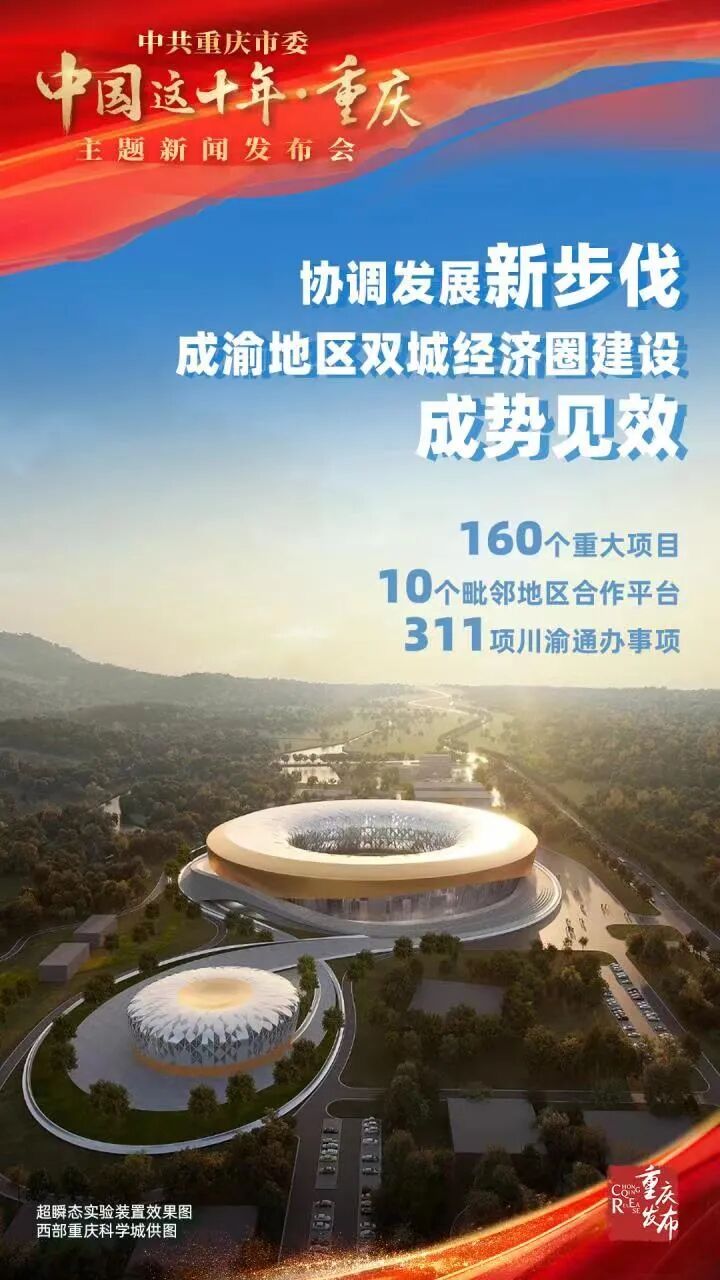 川渝间,强化双核联动、双圈互动、两翼协同,建立四级合作机制,召开五次党政联席会议,深入推进重庆主城都市区和成都“双城”联动联建,一批重大规划、重点改革、重要协议落地,成渝中线、成达万高铁等160个重大项目滚动实施,10个毗邻地区合作平台加快建设,推出311项川渝通办事项,成渝地区在发展态势、创新动能、开放能级、融合融通等方面实现了许多看得见、摸得着的可喜变化,双城经济圈建设进入全面提速、整体成势新阶段。