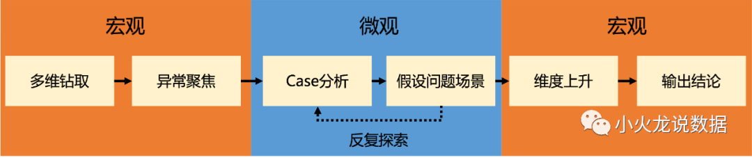 如果到此步,还没能找出核心的问题点,则说明此问题相对隐蔽,并且是我们日常维度累积中没有涉及到的。这个时候就需要我们根据业务场景,假设问题出现的原因,并尝试找到可度量的维度进行验证。当进行完步骤三和步骤四之后,我们已经对可能的问题有了一定的累积,这个时候就可以将此维度上升到宏观层面,利用多维钻取工具进行挖掘,判断是否此问题,导致的指标大幅波动。如果仍然不是此问题,那非常遗憾,仍然需要重复步骤三和步骤四,直至找到相应问题。最后也是最为重要的一步,则是对问题下结论,正所谓“没有结论的分析都是耍流氓”。结论输出需要涵盖“数据发现问题”和“业务解释问题“,在与产运方沟通后,得出“业务化”的结论,这样才能更对老板的口味。不好的结论:pv下降原因,50%是由于母婴类目影响。