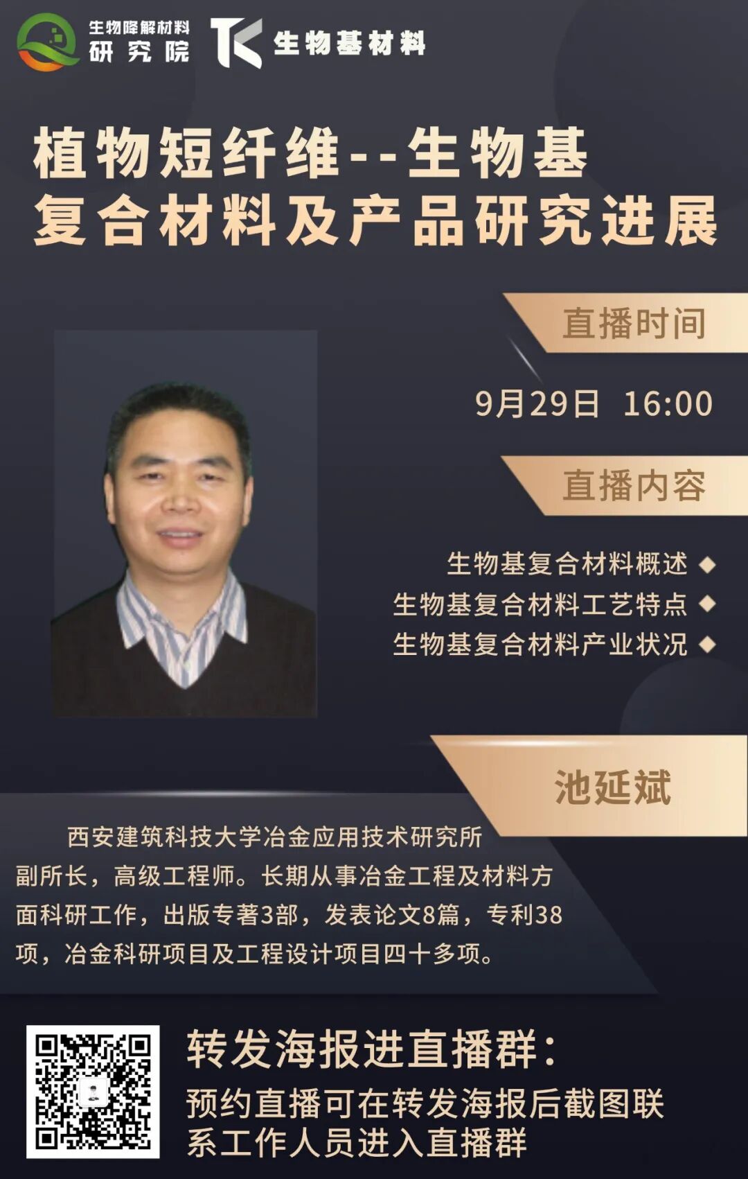 西安建筑科技大学池延斌高级工程师将于9月29日16:00(周四)莅临TK生物基材料直播间,为大家在线分享《植物短纤维-生物基复合材料及产品研究进展》。