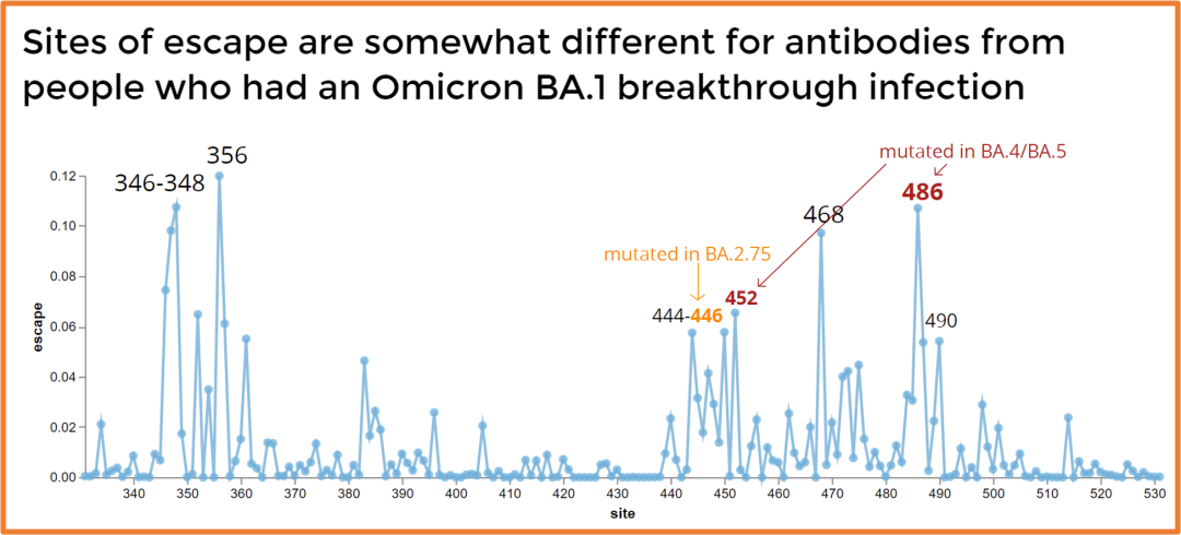 山头的高低,代表该位点针对【疫苗+BA.1既往感染史】这种免疫背景的逃逸能力。
