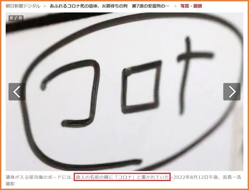 冷库黑板上,每具尸体的姓名旁都写着的[コロナ]字样(新冠);