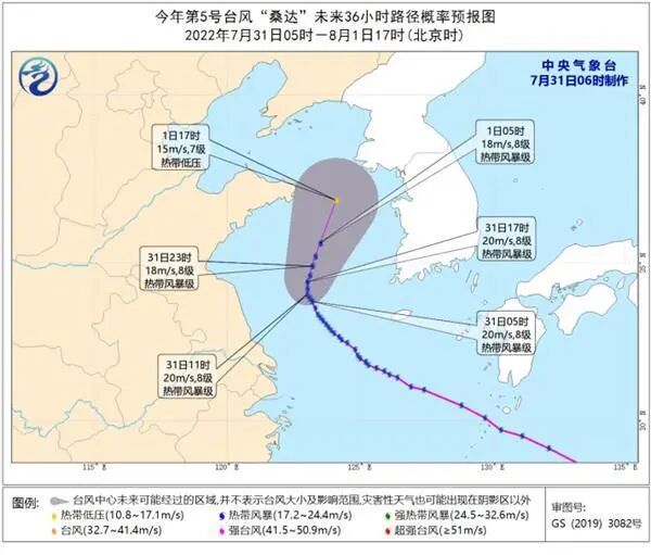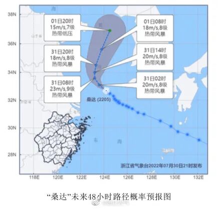 昨天22:55,@浙江天气 发布微博:台风消息:20时位于北纬32.7度、东经124.2度,距离江苏省盐城市偏东方向约385公里的黄海南部海面上。预计,“桑达”将以每小时10~15公里的速度继续向西北转偏北方向移动,逐渐远离我省 ,如无特殊情况,我台将不再发布该台风有关消息 。31日浙北北部和沿海地区仍有雷阵雨,需关注短时暴雨、局地雷雨大风等强对流天气。