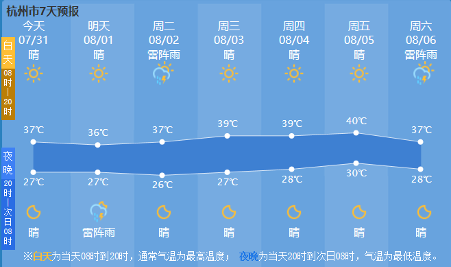 杭州市气象台今日6时11分发布:今天晴到多云,午后局部有短时阵雨或雷雨,有雷雨时短时风雨较大;明天晴到多云,午后有分散性阵雨或雷雨;后天多云,午后有阵雨或雷雨。今天西北风3-4级阵风5级。今天白天最高气温37度,明天白天最高气温37度,明天早晨最低气温27度,今天平均相对湿度65%。