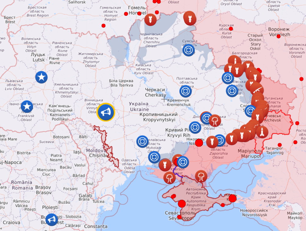 打击现在正在进行中,我们暂时无法预料情况有多严重,现在仅仅知道文尼察地区的Ladyzhyn宣布进入紧急状态,因为俄罗斯导弹袭击发电厂后该市没有供暖和供电。看看地图吧,又是空袭警报一片: