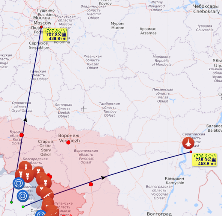 其实看到这里,一个更加邪恶的念头已经压抑不住了。我也测量了一下,从乌克兰腹地到莫斯科,也有700多公里。