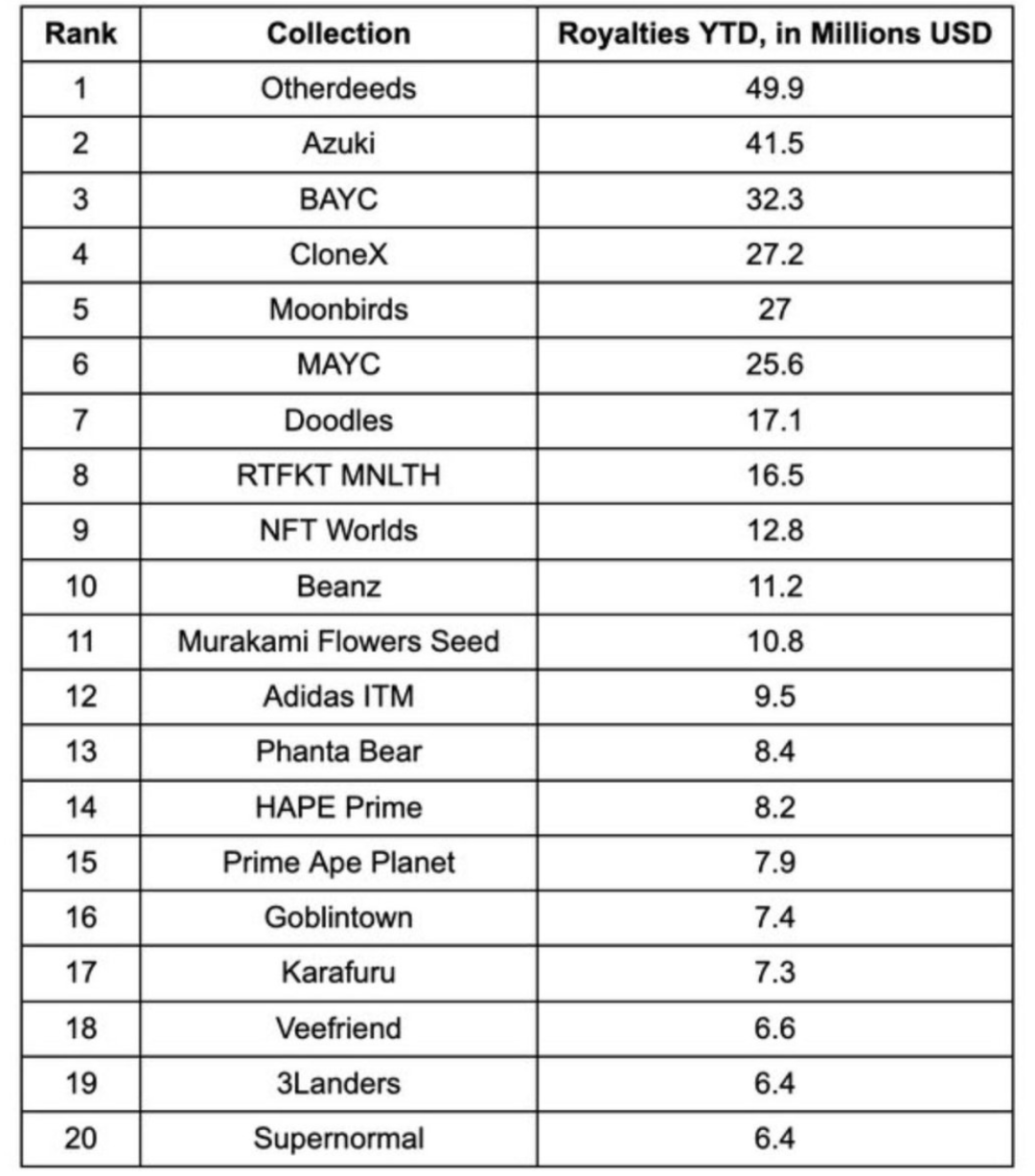 我们抽象出来几百种赚钱模式,其实最终还是要回到区块链本身的价值上。区块链到底有什么价值?我学习到的是,比照传统世界,区块链至少具备了「价值表达」和「价值转移」双重价值。大白话就是,区块链可以极其简单发行、产生资产,这些资产通常会有一个价格标准,区块链还可以传递这些价值即交易。我可以将一枚以太坊以公允价格通过交易中介售卖给另外一个人,或者直接发送。这个简单的过程,其实就是外部山赚钱的终极奥义。再来一张图。这张图是NFT项目版税年度收入排行榜,单位是百万美元。我们可以看到排名第一的Otherdeeds也就是猴子地一年版税收入是4990万美元,约人民币3.25亿。最后一名也有640万美元,一些跌成狗的项目比如Adidas、HAPE Prime也有近千万美元的收入。