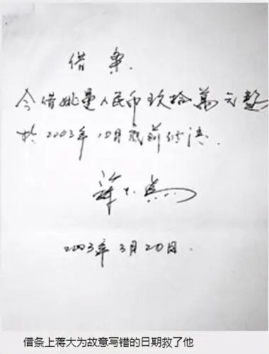 原来,蒋大为在欠条上写的日期为,2003年3月20日,这一天,蒋大为远在加拿大,根本不可能在国内写下欠条。