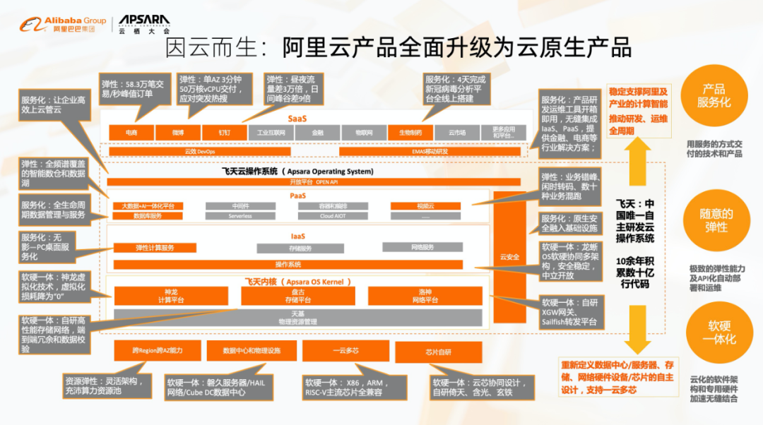 从上图可以看到,最下层是我们的数据中心,这里面我们有昨天刚刚发布的磐久服务器,还有自研的倚天芯片,这些都很好的进行了软硬结合。同时这些架构又以服务化的形式提供给客户,用户在阿里云可以自动化地获得各种架构的芯片,arm,x86,RISC-V等。再往上就是飞天操作系统,是中国唯一自主研发的操作系统,其中的神龙就是非常好的云原生产品,使用了软硬一体的技术真正把原来需要软件做的虚拟化完全通过硬件完成,做到了虚拟化的零损耗。无影也是非常好的通过服务化的形式提供PC桌面服务的云产品。