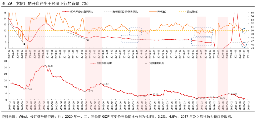 从背景来看,2008年第三季度以来,国际金融危机的加剧对我国经济的冲击也日益严峻,对此国家宏观调控任务也经历一系列调整,从“双防”转向“一保一控”,再转向“保增长、扩内需”,这意味着需要相应的宽松政策来维稳经济,宽信用周期就此展开。