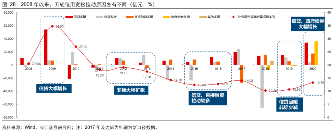 2、历史上的宽信用:效果、结构和路径。2008年以来共经历五轮宽信用:金融危机时期(2008-2010)、产能过剩时期(2012-2013)、供给侧改革初期(2015-2016)、稳杠杆时期(2018-2019)、新冠疫情时期(2020)。因政策工具、实施力度有所差异,每轮宽信用的扩张幅度和持续时间不尽相同。