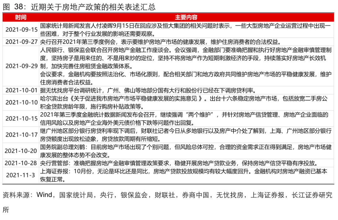 地产方面,“房贷集中度管理”叠加“三道红线”,使得房地产投资两大资金来源(销售回款和再融资)均转向收缩,而近期相关风险事件令局面进一步恶化。但随着信用风险逐步缓释,监管对于地产企业的正常融资行为在表态上有边际回暖,且释放“维护住房消费者的合法权益”等友好信号。我们认为,未来房地产相关政策存在一定的调整空间。