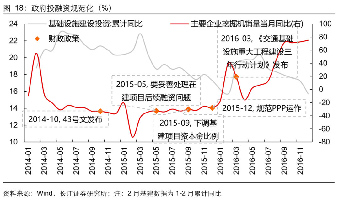 3)本轮财政支持力度较为一般。自2015年5月提出“妥善处理融资平台公司在建项目后续融资问题”,城投债发行监管边际放松;9月基建各行业固定投资项目最低资本金比例下调,以及次年3月出台的《交通基础设施重大工程建设三年行动计划》,均对基建投资有一定提振作用。