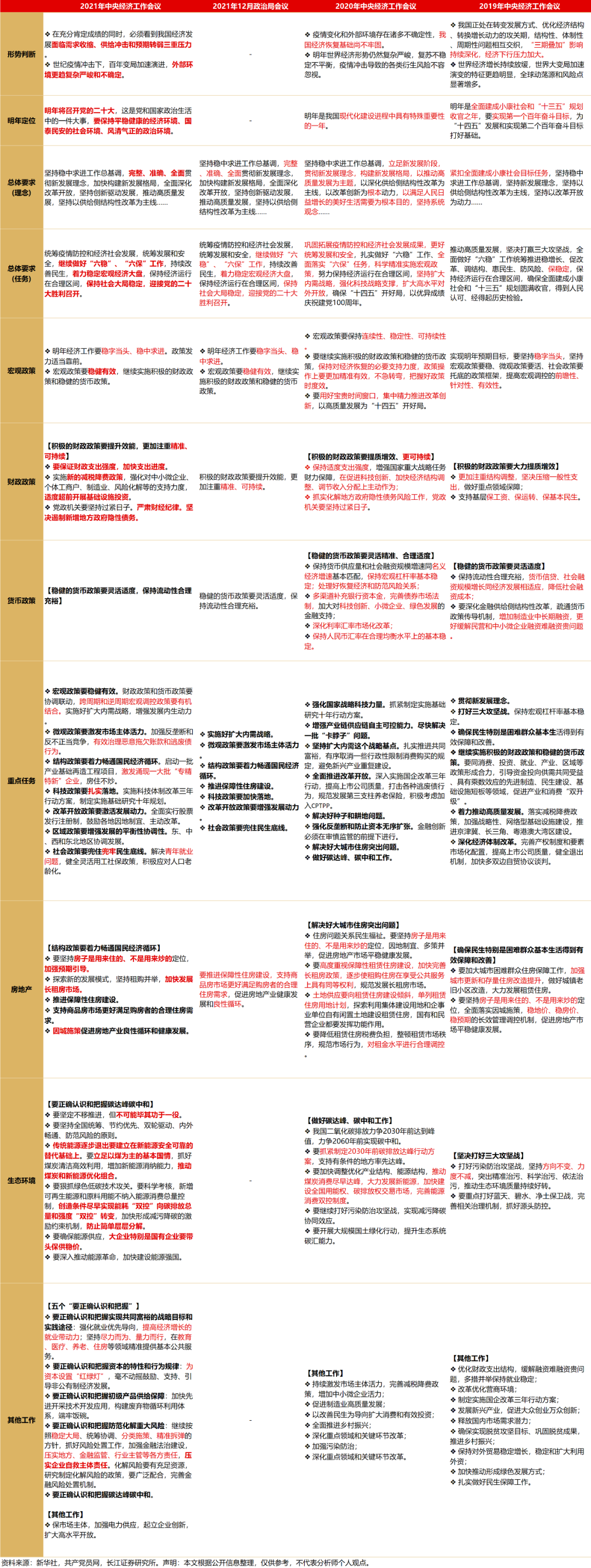 我们的解读:首先,与政治局会议相比,中央经济工作会议关于经济工作的政策基调没有变,核心依然是一个字——“稳”。中央经济工作会议明确指出迎接党的二十大,“要保持平稳健康的经济环境、国泰民安的社会环境、风清气正的政治环境”。其次,与政治局会议相比,信息量、篇幅明显增加:1)形势研判方面,“三重压力”的表述强调了形势严峻;2)“推动经济实现……量的合理增长”、“各地区各部门各方面要担负起稳定宏观经济的责任”、“政策发力适当靠前”、重提“逆周期”以及强调跨周期和逆周期的有机结合,都凸显了稳定经济的迫切性,均在表述上较政治局会议更进一步。