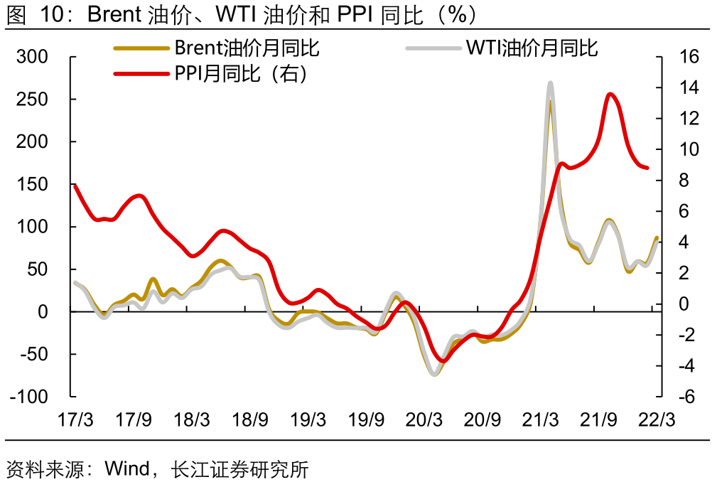 视角二:国际油价上涨带动CPI、PPI环比上行。2月以来,原油需求强劲、供给偏紧使得国际油价持续走高,观察2月通胀数据,可以发现,与油价相关的分项都出现大幅抬升:CPI方面,受国际原油价格上涨影响,我国交通燃料价格环比上涨6.1%,汽油、柴油和液化石油气价格分别上涨6.2%、6.7%和1.3%,工业消费品价格也由上月持平转为上涨0.8%。PPI方面,PPI环比由负转正,其中油气开采行业领涨,环比上涨10.4%,石油相关行业价格上行,石油开采、精炼石油制品价格环比分别上涨13.5%、6.5%,油价推升了我国生产、消费两端的通胀水平。俄乌冲突加速油价上涨,或加剧我国通胀压力。根据统计局公布的统计制度,在统计我国工业品价格时,当月价格以本月5日和本月20日的算术平均价为标准,而实际上截至2月20日,Brent原油、WTI原油价格均未破百,仅从1月的80美元/桶附近分别升至97.61美元/桶、91.07美元/桶。伴随着近期俄罗斯、乌克兰两大能源国家之间的摩擦演变成持续冲突,Brent原油、WTI原油价格已分别突破137美元/桶、123美元/桶,较2月底上行幅度超过或接近30%,对我国形成较大的通胀压力,值得警惕。